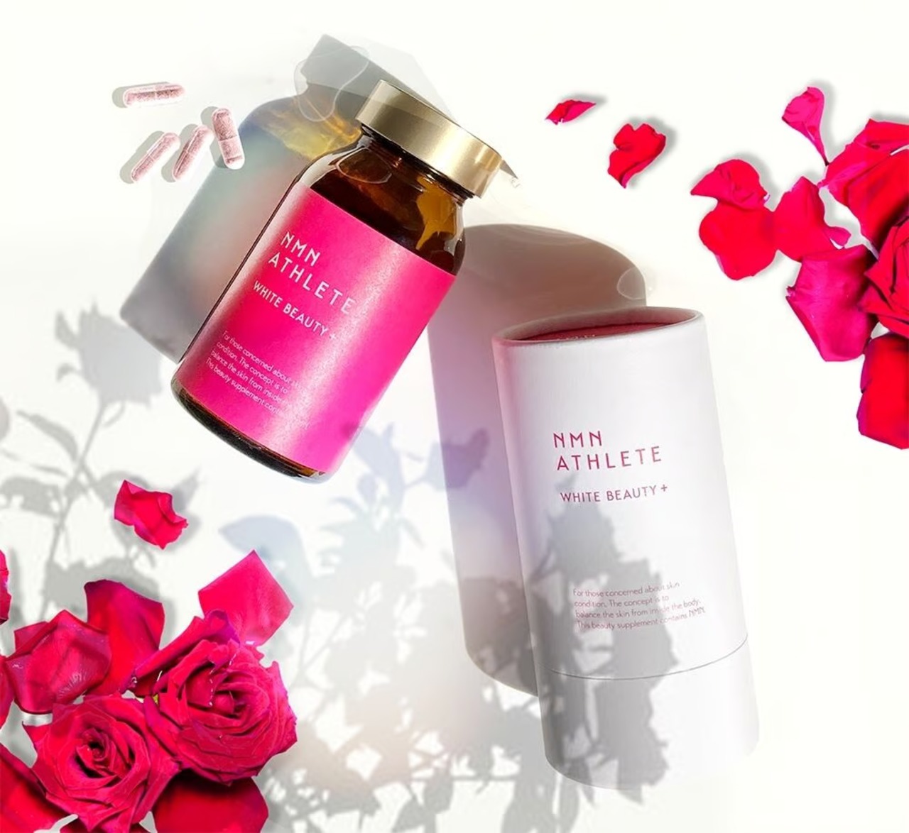 そこに、食べるUVケア・抗酸化成分といわれる特許成分(バラの花びらエキス)、燕の巣エキス、魚由来のコラーゲン、セラミド、ナイアシンなどを配合した日本製純度99.9%以上NMN6000㎎摂取+しっかり美容成分を足した総合美容サプリメント。