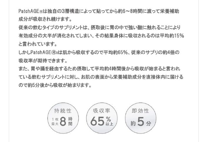 PatchAGE®︎は独自の3層構造によって貼ってから約6~8時間に渡って栄養補助成分が吸収され続けます。