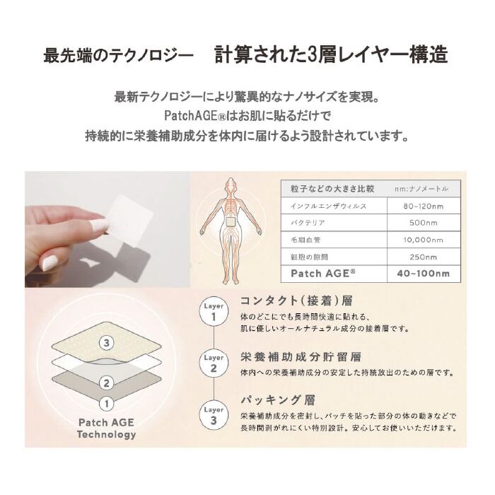 ●PatchAGE®︎に含まれる成分の容量は健康な成人のみに適しています。