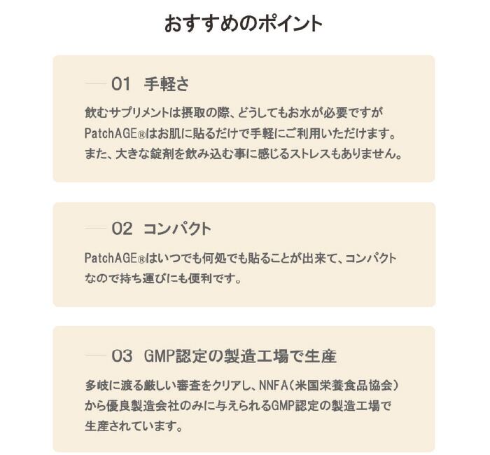 ●PatchAGE®︎に含まれる成分の容量は健康な成人のみに適しています。