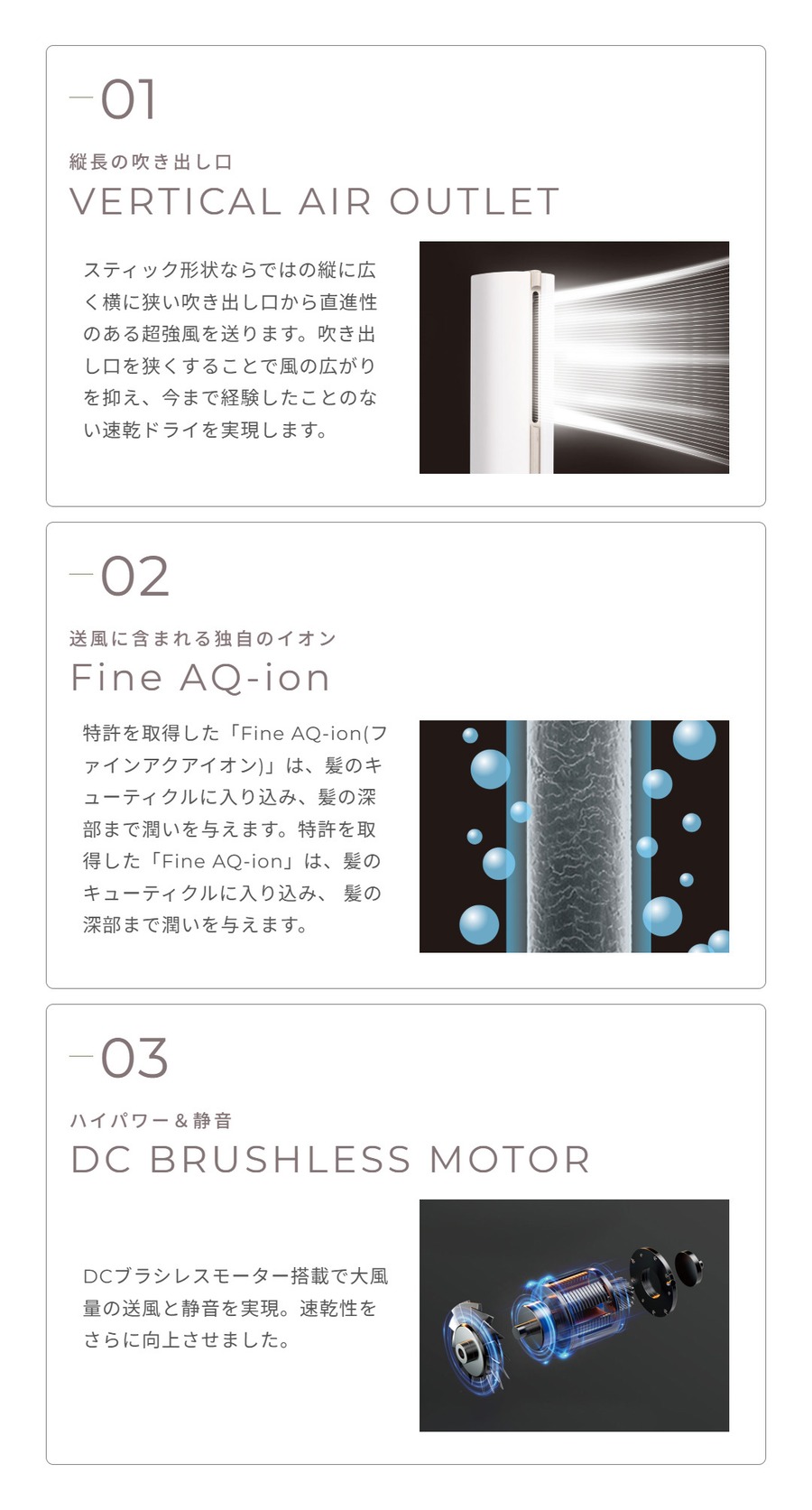さらに、特許を取得した「Fine AQ-ion(ファインアクアイオン)」が髪の深部まで入り込み、美しくハリのあるツヤ髪へ導きます。